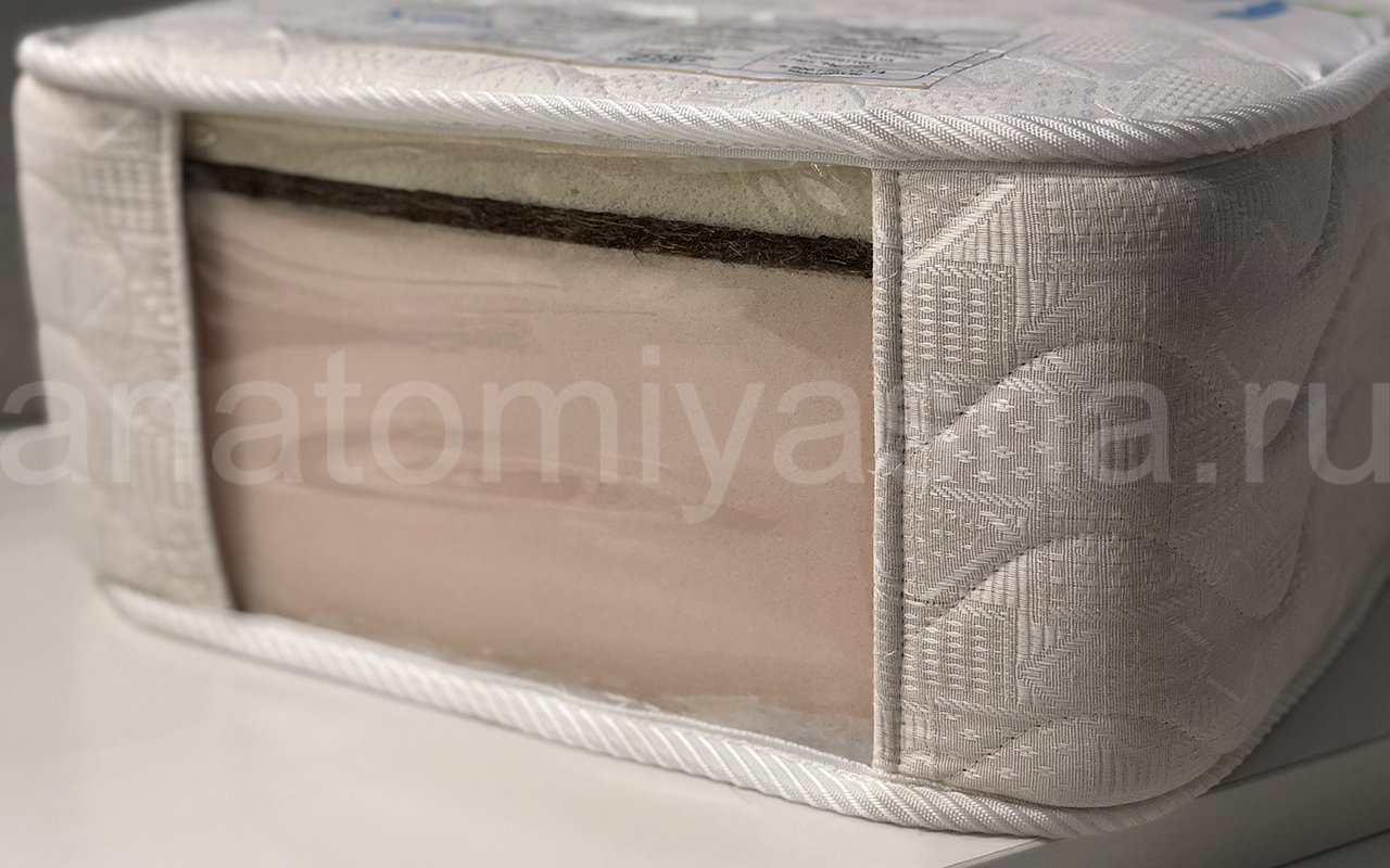 Наличие кокосового волокна толщиной 1 см. в составе придает матрасу жесткость, обеспечивает дополнительную поддержку позвоночника во время сна, формирует ортопедический эффект.